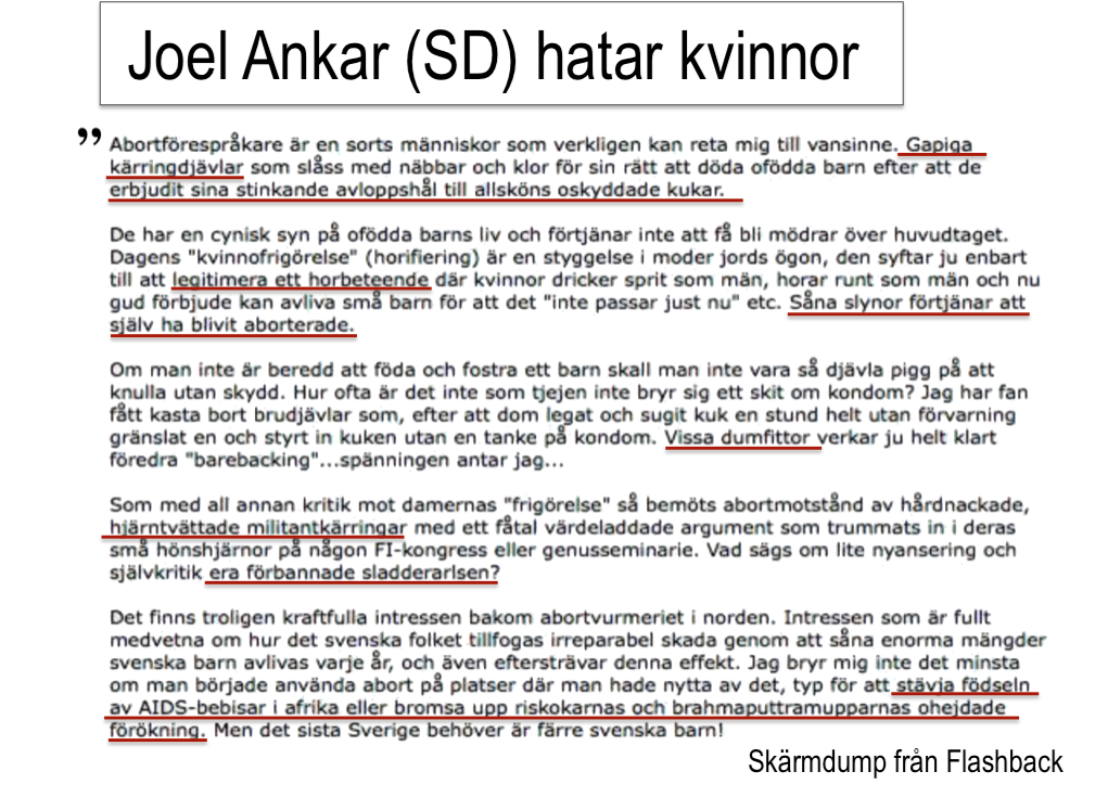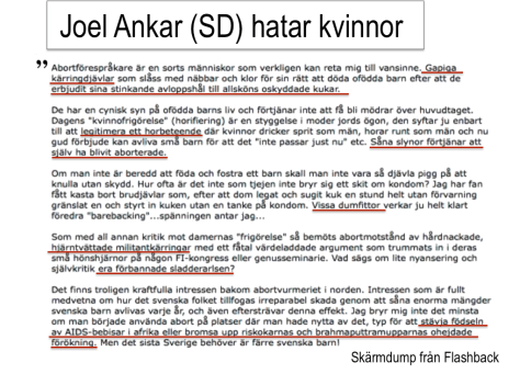 Men Ankar hatar också kvinnor. Särskilt de som har genomgått en abort. Språket är våldsamt och sexualiserat och visar att abortmotståndet har djupa rötter i SD:s politiska kultur: