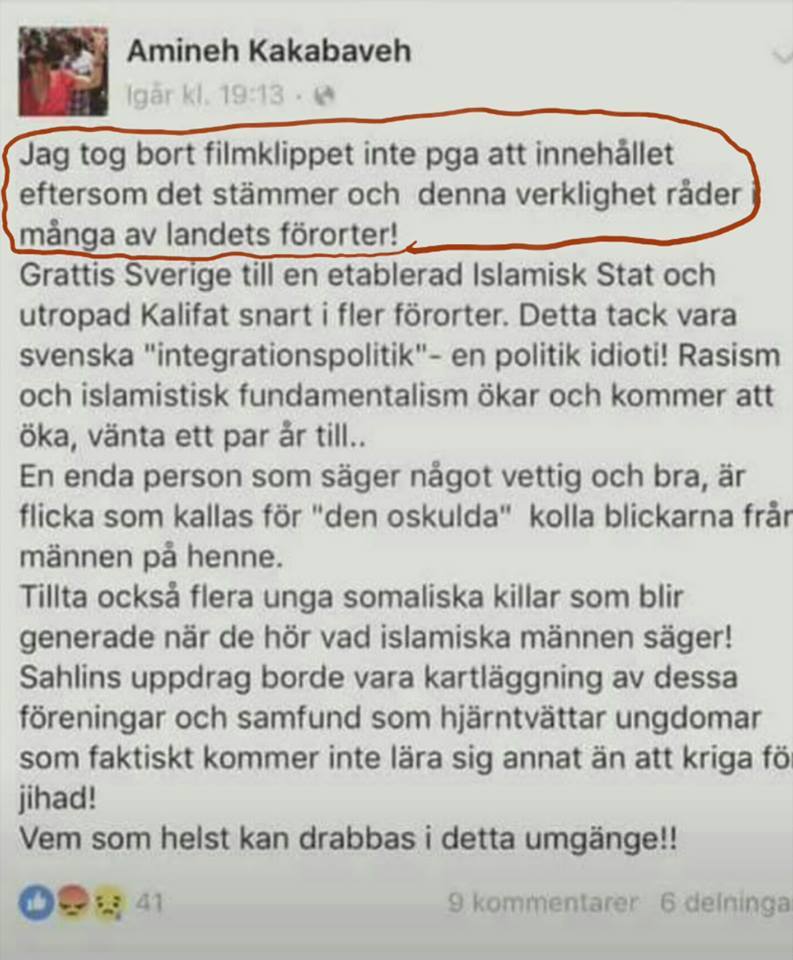 Amineh Kakabaveh raderade även detta Facebook-inlägg.