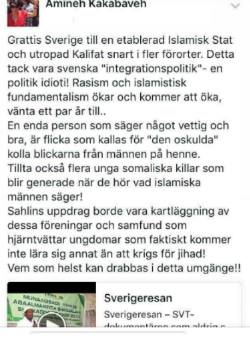 Det berömda frikortet ”jag-är-själv-muslim” används av Amineh Kakabaveh.  Som om det skulle ge henne något slags licens med stämpeln ”jag-kan-sprida-hatet-mot-den-här-gruppen”. Ett sådant beteende med liknande debatterror har vi sett redan, med tanke på förintelseförnekare med judisk bakgrund, som t ex Lasse Wilhelmsson.