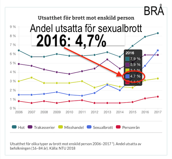 Enligt dessa uppgifter var det 4,7 % som år 2016 uppgav att de utsatts för sexualbrott.