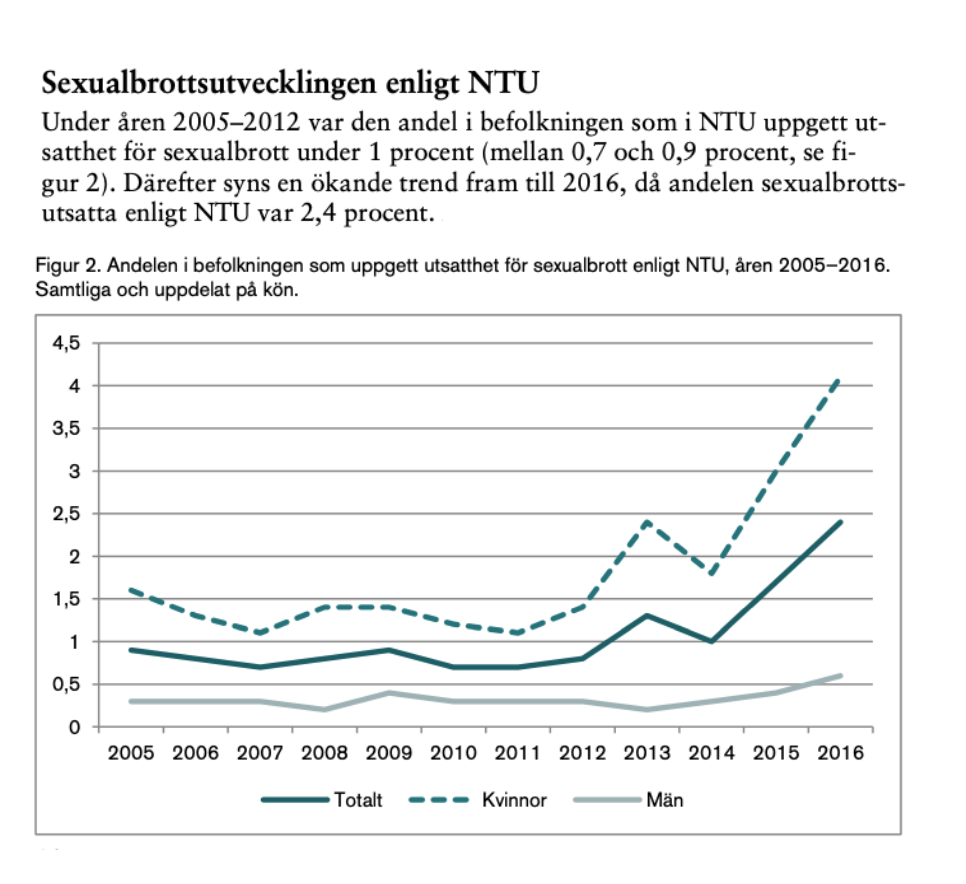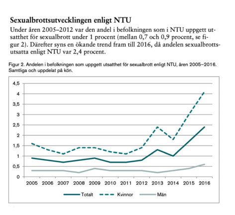 ”Detta, i kombination med att det är relativt få personer som (särskilt tidigare år) uppgett utsatthet för sexualbrott i NTU, innebär att det inte är möjligt att undersöka eventuella förändringar över tid.” (Källa: BRÅ, ”Indikatorer på sexualbrottsutvecklingen 2005-2017”, s. 34)