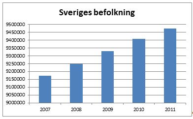Bilden visar ett diagram med siffror från SCB där jag har gjort ett urval för att få fram den totala folkmängden, diagrammet visar alla som är folkbokförda i Sverige mellan 2007 och 2011. Ökningen från 2007 till 2011 är 301 641 människor (9 476 105 – 9 174 464 = 301 641). I genomsnitt per år är det en ökning med 60 328 personer i Sverige (301 641 / 5 = 60 328). Vi är alltså 9 476 105 människor boende i Sverige. En ökning med 60 328 personer innebär en befolkningsökning i procent med 0,64 % per år. Totalt. Inklusive invandring.