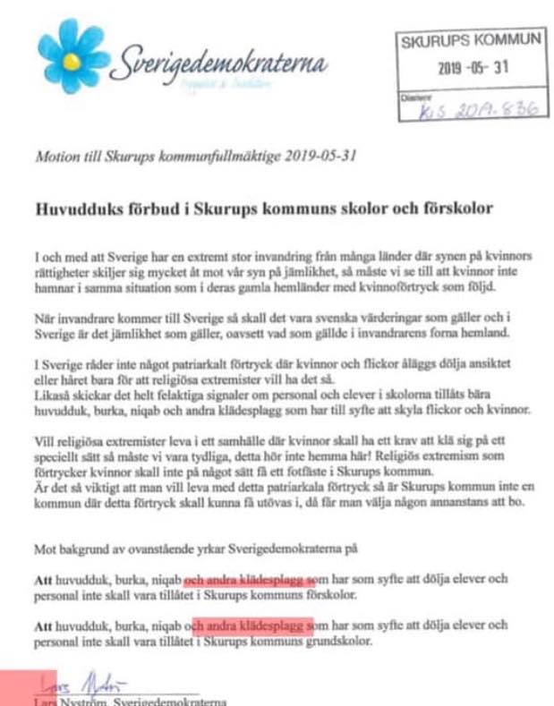 Den 16 december 2019 var det dags för Skurups kommunfullmäktige att bifalla Sverigedemokraternas motion om slöjförbud. I motionen läser vi ”att huvudduk, burka, niqab och andra klädesplagg som har som syfte att dölja elever och personal inte skall vara tillåtet i Skurups kommuns förskolor”. Samma formulering finns vad gäller förbudet i grundskolor. (Källa: SVT)