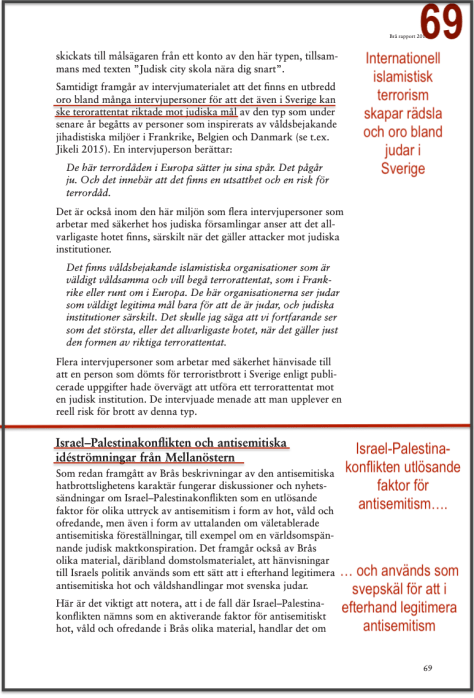 ”delar av den antisemitiska hatbrottslighet som sker, såväl i Sverige som i andra europeiska länder, sannolikt härrör från en närmast sanktionerad antisemitism som förekommer i olika länder i Mellanöstern. Enligt litteraturen rör det sig ofta om antisemitiska föreställningar och attityder som existerat redan innan staten Israel grundades”. (Källa: BRÅ 2019:4 Antisemitiska hatbrott, s. 70)