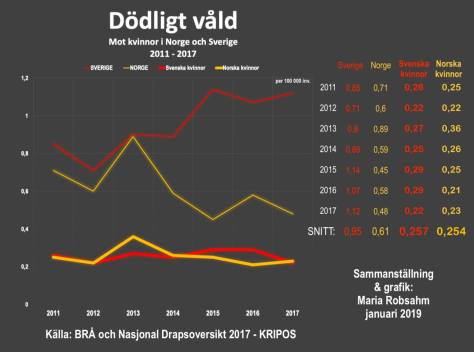Under åren 2011 – 2017 var det alltså lika många norska kvinnor som svenska kvinnor som mördades per capita. Det handlar om drygt 0,25 per 100 000 invånare.