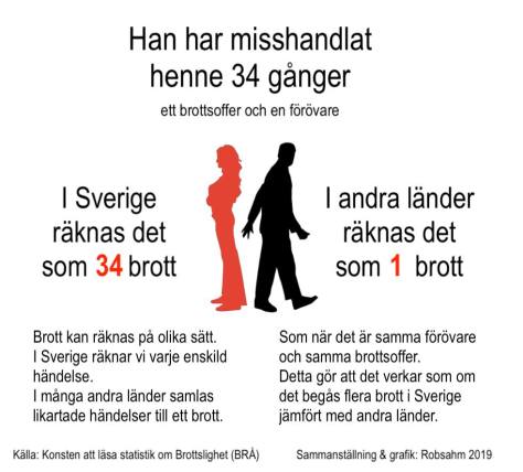 - Statistikföringen mellan länder skiljer sig åt: I många länder gallras vissa anmälningar bort (anmälningar som i initialt skede inte bedöms som brott), i Sverige registreras varje anmälan