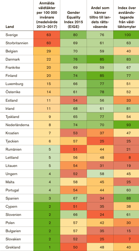 Under 2019 anmäldes i Sverige 63 våldtäkter per 100 000 invånare (störst andel i Europa tillsammans med England-Wales). Som jämförelse anmäldes i Grekland en (1) våldtäkt per 100 000 invånare under samma period.