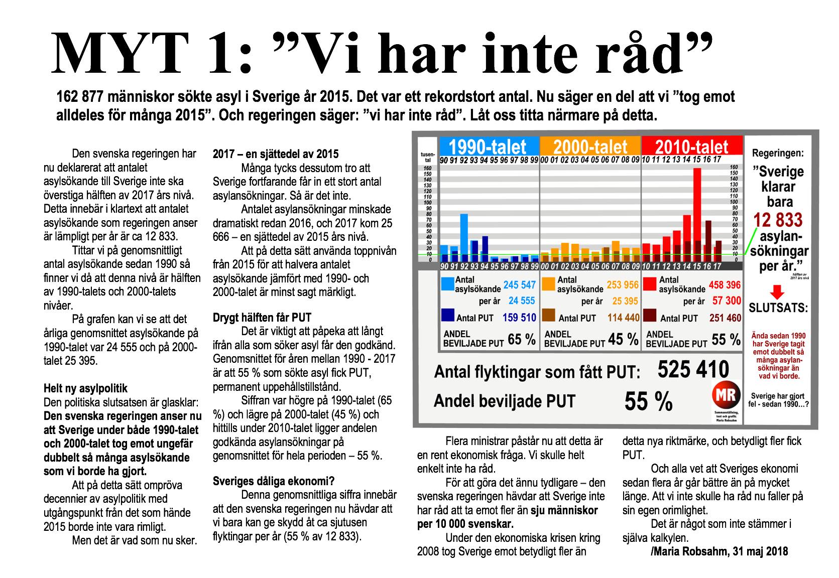 Det är viktigt att påpeka att långt ifrån alla som söker asyl får den godkänd. Genomsnittet för åren mellan 1990 – 2017 är att 55 % som sökte asyl fick PUT, permanent uppehållstillstånd.