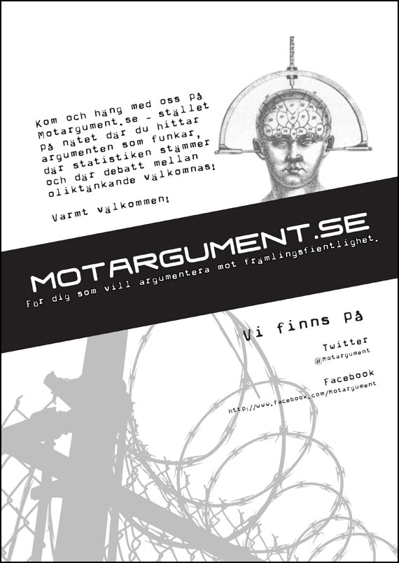 Här till höger ser du en affisch som vi har gjort för utskrift. Den är gjord som A4, men kan också skrivas ut som A3. Affischen är fri att skrivas ut och sättas upp på stan, i samband med olika evenemang som har med antirasism att göra — tja, överallt där det passar.