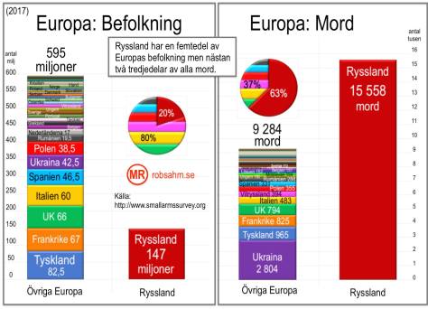 Den andra grafen fokuserar på Europa. Där kan vi se att Ryssland intar en unik position i vår del av världen. Ryssland har en femtedel av Europas befolkning men nästan två tredjedelar av alla fall av dödligt våld.