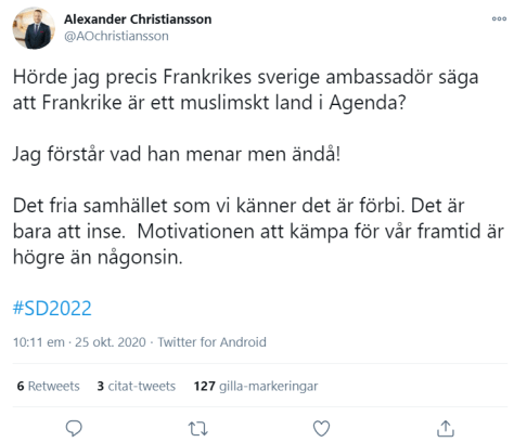 I en diskussion om mordet på historieläraren Samuel Paty i Paris av den islamistiske terroristen Abdullakh Anzarov nämnde Frankrikes sverigeambassadör att Frankrike är ett land för alla fransmän, inklusive franska muslimer. Detta föranledde SD-riksdagsmannen Alexander Christiansson att dödförklara det fria samhället genom följande tweet: