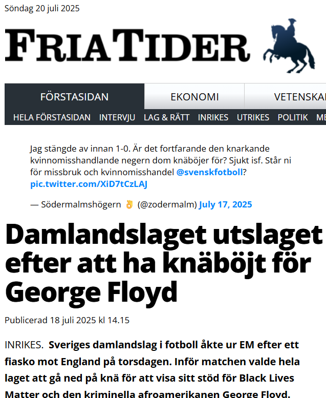 ”Inför matchen valde hela laget att gå ned på knä för att visa sitt stöd för Black Lives Matter och den kriminella afroamerikanen George Floyd.” (Källa: Fria tider)