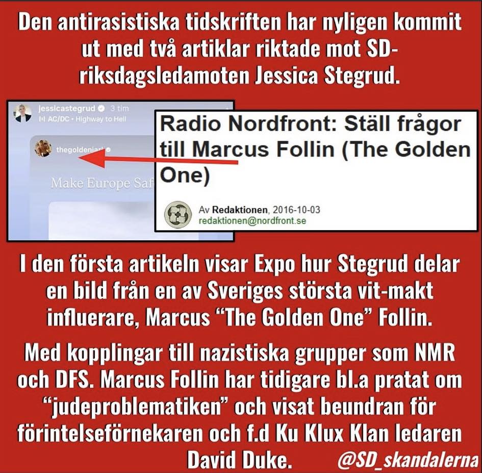 Den antirasistiska tidskriften Expo har nämligen nyligen kommit ut med två artiklar riktade mot SD-riksdagsledamoten Jessica Stegrud, men även mot Nick Alinia (även kallad för “Stegruds lilla handväska”). I den första artikeln visar Expo hur Stegrud delar en bild från en av Sveriges största vit-makt influerare, Marcus “The Golden One” Follin, med kopplingar och stöd till bl.a nazistiska Nordiska Motståndsrörelsen och högerextrema Det fria Sverige. Marcus Follin har tidigare bl a pratat om “judeproblematiken” och visat beundran för förintelseförnekaren och f.d Ku Klux Klan ledaren David Duke.
