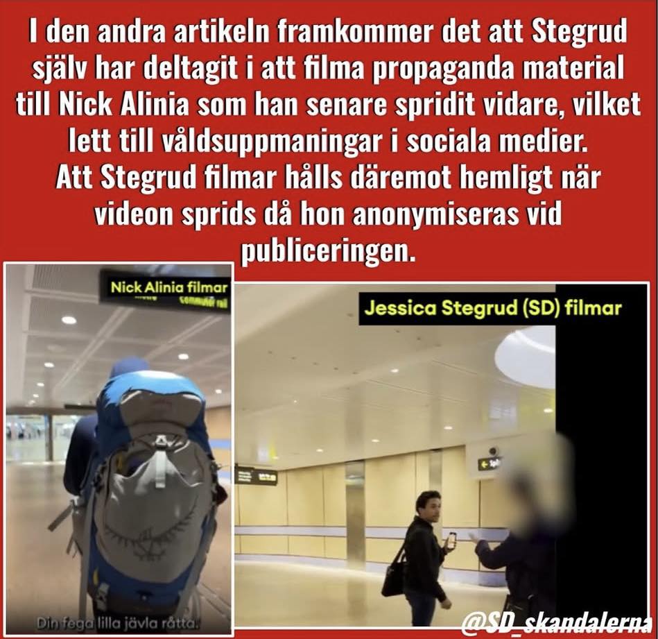 I den andra artikeln framkommer det att Stegrud själv har deltagit i att filma propaganda material till Nick Alinia som han senare spridit vidare, vilket lett till våldsuppmaningar i sociala medier. Att Stegrud filmar hålls däremot hemligt när videon sprids då hon anonymiseras vid publiceringen.