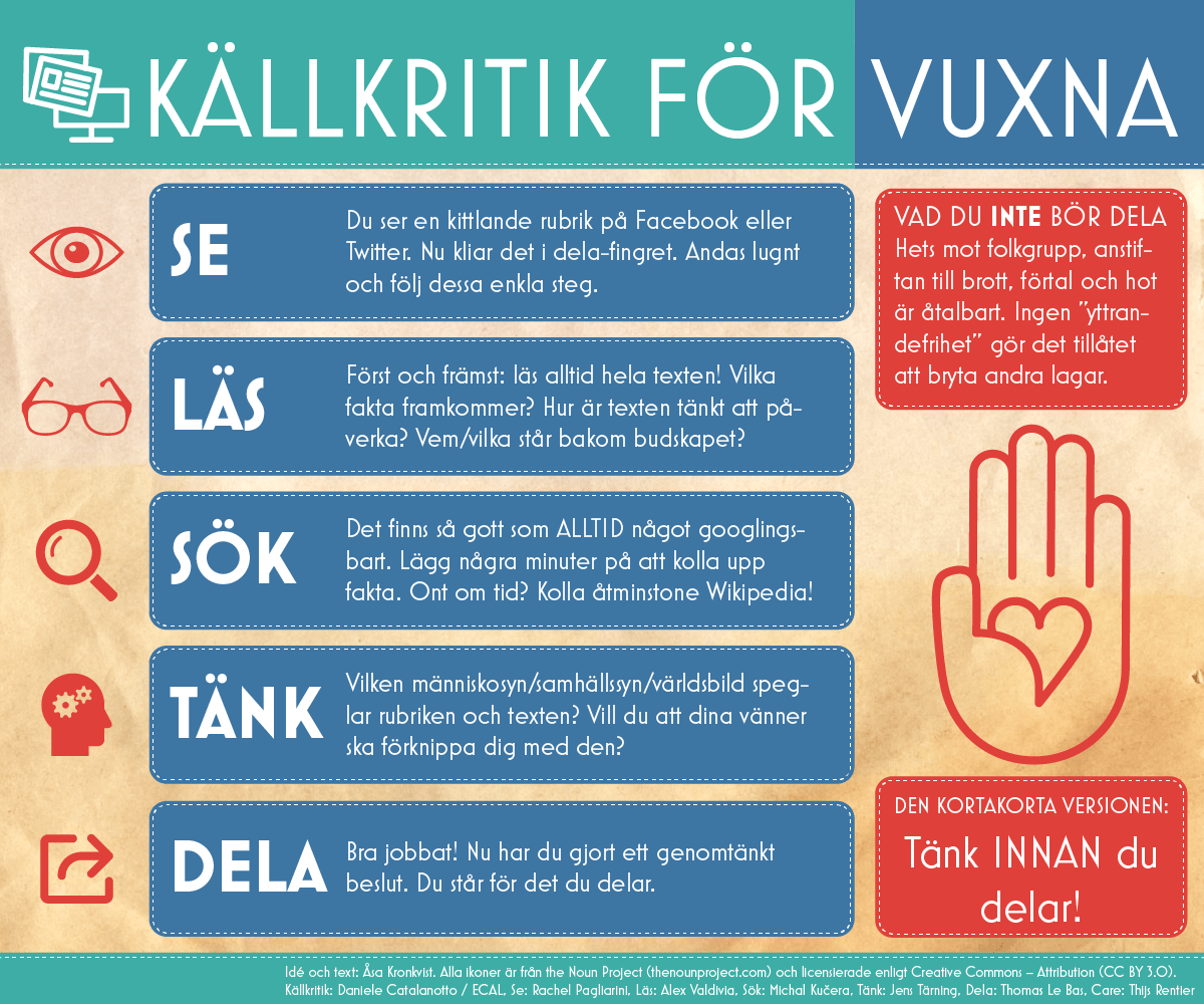 Tyvärr saknar alltför många av oss förmåga till källkritik. Är det dessutom påståenden som tilltalar oss, och stämmer in i våra åsikter och samhällssyn, är det stor risk att vi delar vidare saker vi inte har verifierat. Motargument uppmanar våra läsare att vara försiktiga med att dela saker vi inte med säkerhet vet stämmer.