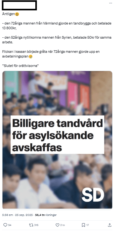 Som ett brev på posten efter att Tidöregeringen förkunnat att tandvårdsstödet för asylsökande avskaffas sprids nu falska historier om just 50-kronorstandvården. I inlägget läser vi: