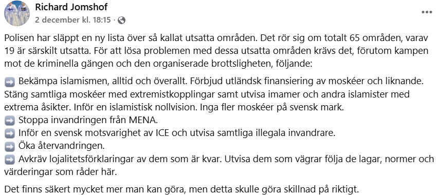 Sverigedemokraternas partisekreterare Richard Jomshof gick i veckan till angrepp mot islam och invandring i ett inlägg på sin Facebooksida, i samband med att polisen publicerat sin nya lista över så kallade utsatta områden. Han lägger skulden för dessa områden på religion och invandring.