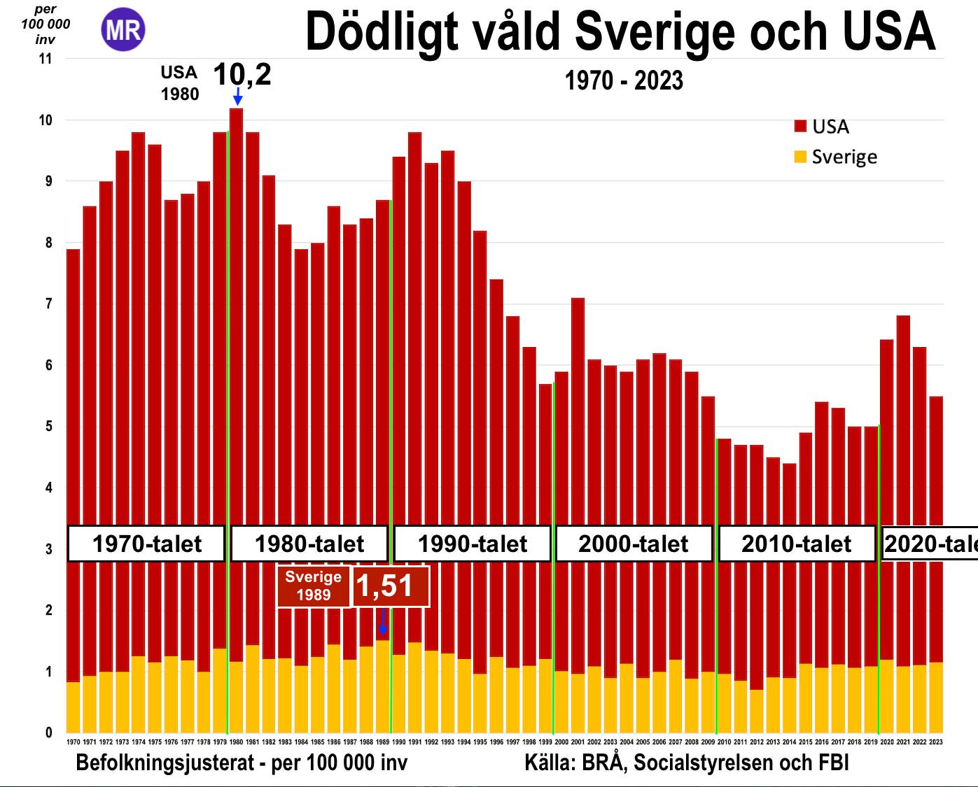 I Sverige har vi haft betydligt mer hovsamma siffror. Medan det dödliga våldet i över femtio år har legat på i stort sett samma nivå kring 1 per 100 000 invånare, så har det fluktuerat betydligt mer i USA. Den högsta nivån var 1980 på 10,2 och sedan dess har det minskat. I Sverige var den högsta nivån under åren sedan 1970, 1989 på 1,51.