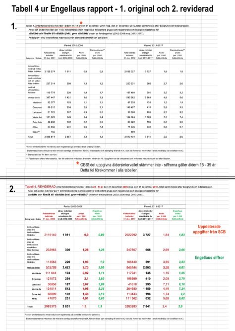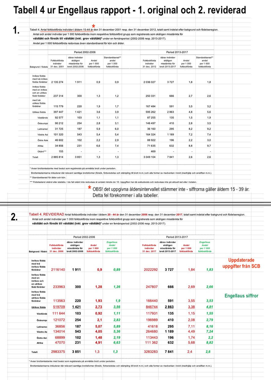 Jag bifogar en jämförelse mellan Engellaus statistik och den revidering som jag har gjort utifrån en översyn av räknemetoden för de folkbokförda – specifikt för tabell 4 som rör våldtäkt.