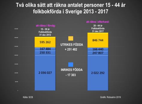 I sig är det naturligtvis inte särskilt märkligt. Under perioden 2013-17 hade Sverige ett mycket stort inflöde av utrikes födda till Sverige. Därför blir det också stor skillnad på att räkna antalet utrikes födda 2012 eller 2017.