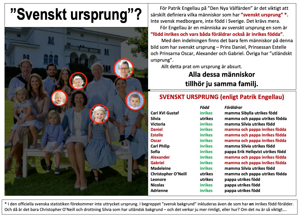 Att prata om ursprung är ett eget påhitt av Engellau och det förekommer inte i den officiella svenska statistiken. Däremot finns begreppet ”svensk bakgrund”. Där inkluderas även de människor som har en svenskfödd förälder. Med denna terminologi är det på bilden bara Christopher O’Neill och drottning Silvia som har utländsk bakgrund. Och det verkar ju mer rimligt, eller hur? Om det nu är så viktigt…