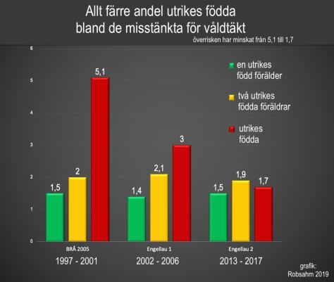 De siffror som vi nu har genom Engellaus rapport visar något mycket intressant. När det gäller gruppen utrikes födda så har alltså överrisken sjunkit dramatiskt när det gäller antalet skäligen misstänkta för våldtäkt. Från 5,1 i BRÅ:s rapport 2005 till 1,7 för perioden 2013-2017 i Engellaus rapport.