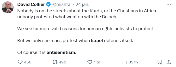 Högerextremister och ”sverigevänner” på sociala medier sprider en myt om att människor som kritiserar, fördömer eller säger sig vara emot Israel och dess regims politik per automatik skulle vara antisemiter. Det de missar i sin iver att sprida detta narrativ är att även många judar i Israel och världen över fördömer och är kritiska mot Israels illgärningar i kriget mot Hamas. Att ha åsikter och synpunkter om Israels regim är inte synonymt med att vara antisemit. Vi ska komma ihåg att anklagelser om antisemitism är en strategi för att tysta människor som kritiserar, ifrågasätter och fördömer Israels pågående folkmord i Gaza.
