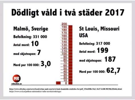 När jag la ut denna bild gick Tino Sanandaji i taket. Och han sa att det inte gick att jämföra USA med Sverige på det sättet. Hans sedvanliga koleriska retorik gjorde det svårt att förstå vad han ville ha sagt. Att jämföra Sveriges farligaste stad (högst nivå av dödligt våld) med motsvarande stad i USA är naturligtvis en fullt rimlig jämförelse.