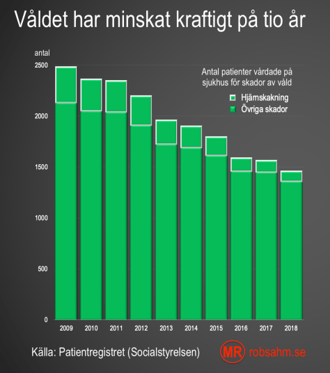 Jag vet att dessa fakta förvånar många, vana som vi har blivit vid rapporterna om ständigt ökande våld. Men patientregistrets siffror är entydiga. Minskningen av det allvarliga, men icke-dödliga våldet i Sverige är kraftig.