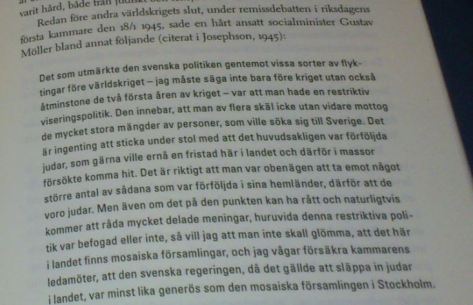 ”I samband med den nationalsocialistiska regimens upprättande i Tyskland och under tiden därefter infördes, såsom bekant, stadganden, som dels stämplade vissa politiska rörelser som illegala, dels ock i hög grad inskränkte den tyskjudiska befolkningens förvärvsmöjligheter inom landet. Följden av denna lagstiftning har blivit en omfattande utvandring från Tyskland. Denna utvandring har förorsakat betydande svårigheter för ett stort antal länder. De spärrar, som överallt rests mot icke önskvärd invandring, ha ej kunnat upprätthållas mot denna emigrantström. Särskilt ha det tyska rikets grannstater nödgats öppna sina gränser för att mottaga ifrågavarande flyktingar. Men även vårt land har fått känning av denna nya faktor på folkutbytets område. Spörsmålet om asylrätten, som vid tiden för utlänningslagens tillkomst var av huvudsakligen teoretiskt intresse, har fått en oanad aktualitet. Ett icke ringa antal politiska flyktingar ha sökt sig hit, och även den judiska utvandringsströmmen har vänt sig mot vårt land. (Källa: SOU 1936:53, s. 8. Fetstilen har jag lagt till)