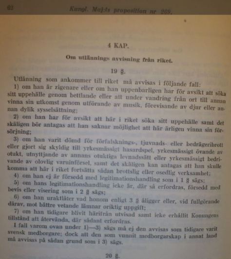 Det var med hänvisning till 4 kap, paragraf 19 och 20 man avvisade judarna och lät en del politiska flyktingar komma in i landet. ”Om han har för avsikt att här i riket söka sitt uppehälle”….