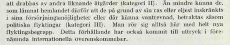”Det framstår som klart, att den inom folkrätten utbildade definitionen å politisk flykting ej numera är tillräckligt omfattande. I fråga om en del av de ryskfödda personer, vilka sedan länge vistats här i landet, torde det näppeligen kunna antagas, att de i sitt hemland skulle riskera ansvar för politiskt brott. Antalet tyska politiska flyktingar enligt nämnda bestämning lärer visserligen vara stort i och för sig. Men i förhållande till hela mängden av flyktingar är deras antal ringa. Man har skäl att antaga, att av det hundratusental personer, som under de senaste fyra åren lämnat Tyskland, blott en mindre del tillhöra denna grupp (kategori I). Som politiska flyktingar enligt hävdvunnen terminologi lära icke de kunna anses, vilka i sitt hemland ej begått något brott men som på grund av sin politiska åskådning eller andra politiska skäl riskera att bliva intagna i koncentrationsläger eller att drabbas av andra liknande åtgärder (kategori II). Än mindre kunna de, som lämnat hemlandet därför att de på grund av sin ras eller eljest inskränkts i sina försörjningsmöjligheter eller där känna vantrevnad, betraktas såsom politiska flyktingar (kategori III). Man rör sig alltså här med helt nya flyktingsbegrepp. Detta förhållande har också kommit till uttryck i förenämnda internationella överenskommelser.” (Källa: SOU 1936:53, s. 56. Fetstilen har jag lagt till)
