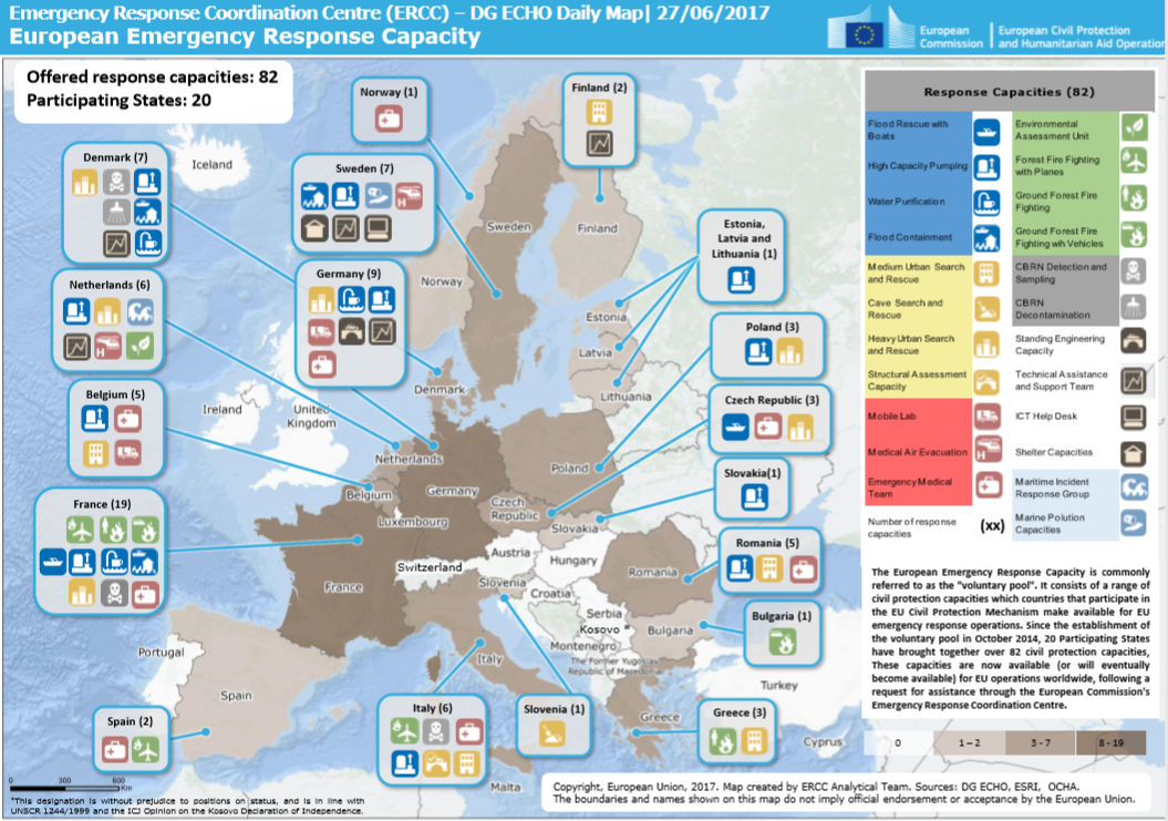 FALSKT. Det finns ett samarbete bland EU-länderna, koordinerat av ERCC (Emergency Response Coordination Centre), så att länderna kan hjälpa varandra vid krissituationer. I oktober 2014 etablerades en ”frivillig pool” bestående av 20 länder, och som tillhandahåller 82 civilskyddskapaciteter. Sverige har 7 stycken av dessa kapaciteter: Översvämningsskydd, högkapacitetspumpning, havsförorening, medicinsk luftevakuering, skyddskapacitet, teknisk assistans och support och ICT helpdesk.
