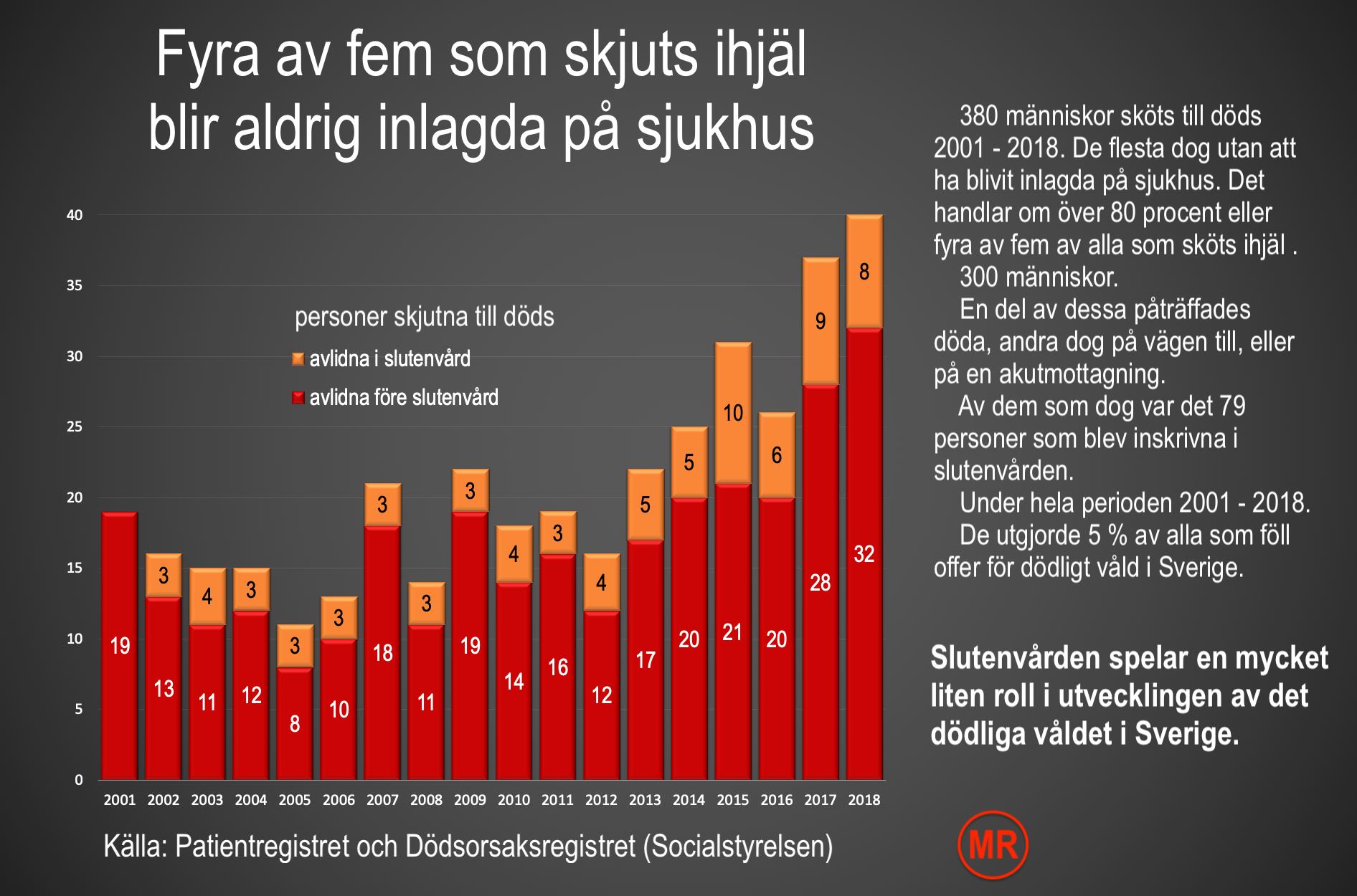 Ett mycket intressant faktum i sammanhanget är att av dessa 380 ihjälskjutna människor dog de allra flesta utan att ha blivit inlagda på sjukhus. Det handlar om 80 procent eller fyra av fem av alla som sköts ihjäl. 300 människor.