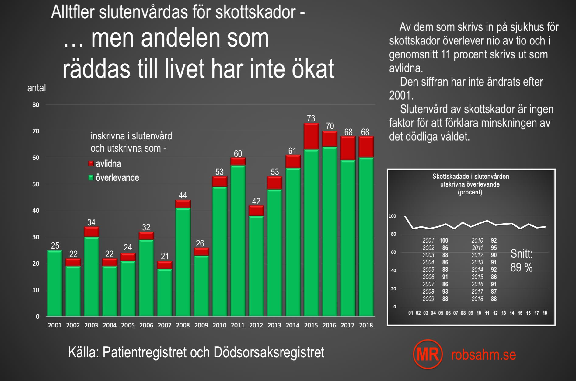 För att verkligen kunna jämföra hur utvecklingen har sett ut när det gäller sjukvården av dem som skottskadas så måste vi först få klart för oss hur många det handlar om. Ungefär en fjärdedel av alla som 2001-2018 föll offer för dödligt våld blev skjutna till döds.
