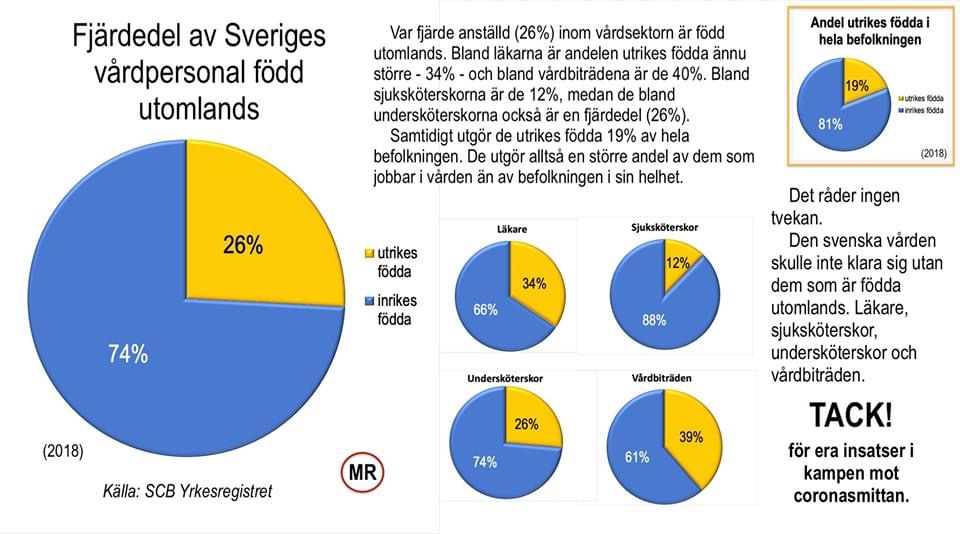 Samtidigt utgör de utrikes födda 19% av hela befolkningen. De utgör alltså en större andel av dem som jobbar i vården än av befolkningen i sin helhet.