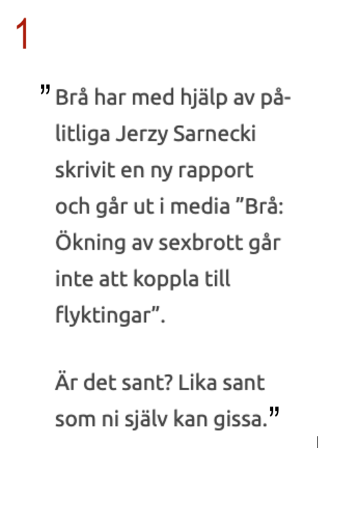 Det handlar om en fråga som diskuteras på 6 av rapportens 116 sidor: ”Med hänsyn till den offentliga debatten om sambandet mellan flyktingtillströmningen 2015 och ökningen av polisanmälda och rapporterade sexualbrott i NTU, har Brå gjort vissa övergripande analyser för att försöka pröva frågan.”