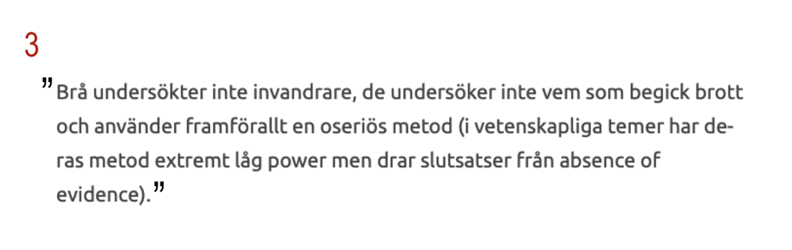 Andra delen av citat 3 är än mer besynnerlig. Det handlar om någon sorts metodkritik. Han påstår att ”i vetenskapliga temer har deras metod extremt låg power men drar slutsatser från absence of evidence”.