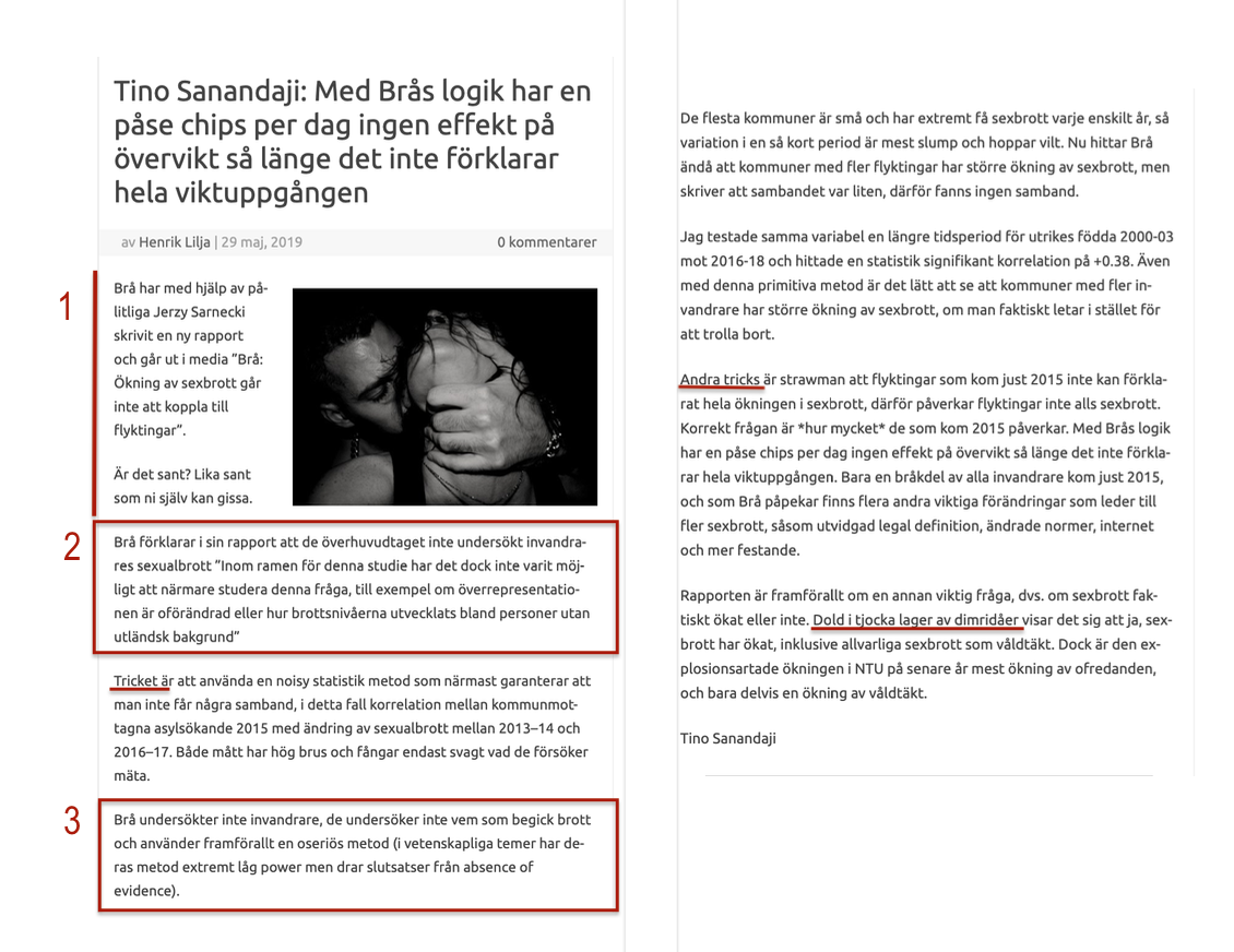 1. BRÅ:s rapport har kritiserats för att vara undermålig rent vetenskapligt. Detta är dumheter. Rapporten är mycket tydlig med hur frågan kan besvaras inom ramen för just den här studien. Och man använder standardmetoden som alltid används vid alla empiriska undersökningar: Man ställer upp en hypotes om ett möjligt samband och sedan undersöker man om man hittar något sådant samband. När man inte hittar något samband så säger man det: ”Vi hittade inget samband”.